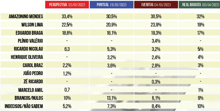 Amazonino, no mesmo período oscilou entre 30,5% (o pior) e 33,4% (o melhor). Eduardo Braga registrou 17% como pior intenção de votos e 19,3% como a melhor intenção de votos em pesquisa.