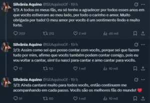 “Assim como sei que posso contar com vocês, afirmo que vocês também podem contar comigo, pois eu vou voltar a cantar, sim! Eu nasci para cantar e amo cantar para vocês. Ainda cantarei muito para todos vocês, então continuem me acompanhando em cada passo”, declarou.