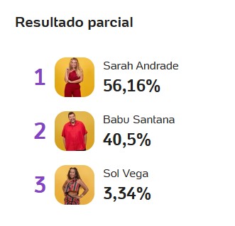 Babu, Sarah e Sol Vega foram os emparedados dessa semana no BBB 26. Segundo a enquete realizada pelo Portal Uol, a veterana do BBB 21 lidera a votação com 56,16% dos votos. Babu aparece em segundo, com 40,5% dos votos. Aparecendo como coadjuvante no embate desta semana, Sol Vega tem apenas 3,34% dos votos.