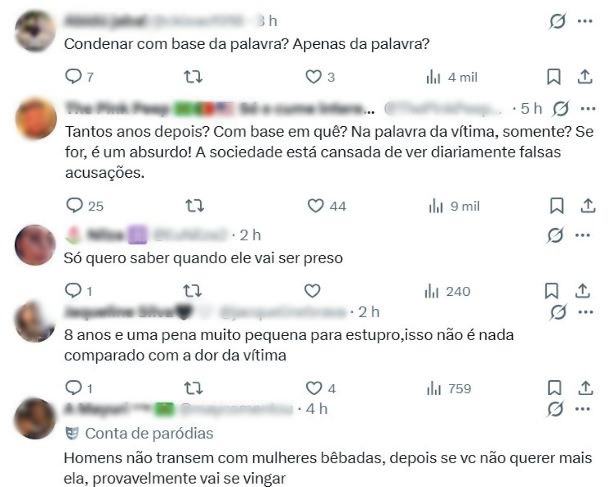 A decisão da Justiça gerou comentários mistos dos internautas no X (antigo Twitter). “Condenar com base da palavra? Apenas da palavra?”, expressou um usuário da rede social. Outro internauta questionou: “Tantos anos depois? Com base em quê? Na palavra da vítima, somente? Se for, é um absurdo! A sociedade está cansada de ver diariamente falsas acusações”.