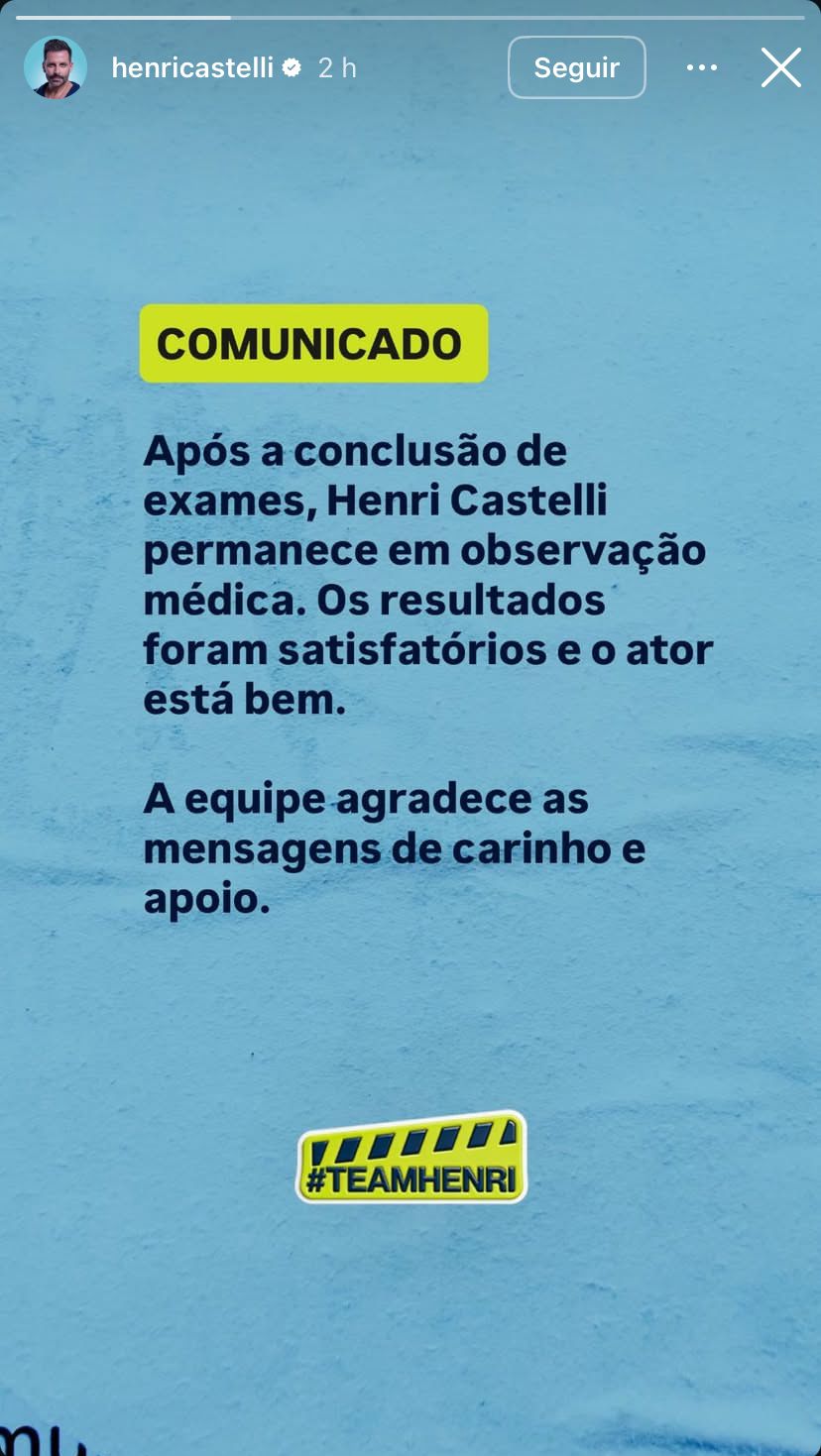 De acordo com o comunicado, Henri continua sob observação médica depois de realizar uma série de exames, que tiveram resultados considerados positivos. “Após a conclusão de exames, Henri Castelli permanece em observação médica. Os resultados foram satisfatórios e o ator está bem”, informou a equipe.