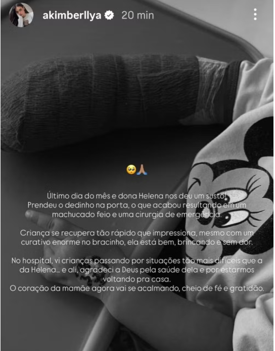 A mãe dela, Amanda Kimberly, contou nas redes sociais, nesta sexta-feira (31/10), como tudo aconteceu. “Último dia do mês e dona Helena nos deu um susto. Prendeu o dedinho na porta, o que acabou resultando em um machucado feio e uma cirurgia de emergência. Criança se recupera tão rápido que impressiona, mesmo com um curativo enorme no bracinho, ela está bem, brincando e sem dor”, escreveu ela ao postar uma foto da filha.