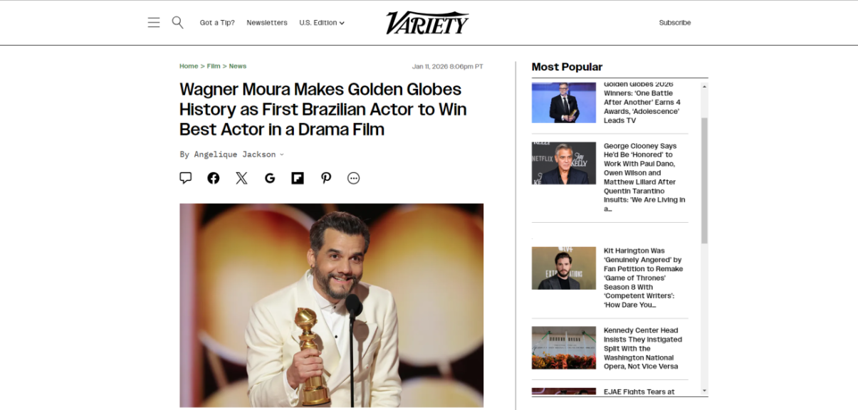O desempenho do Brasil no Globo de Ouro 2026 chamou a atenção da imprensa internacional após a cerimônia realizada neste domingo (11/1). O filme O Agente Secreto saiu consagrado como Melhor Filme de Língua Não-Inglesa, enquanto Wagner Moura levou o prêmio de Melhor Ator em Filme de Drama, garantindo duas vitórias históricas para o país.