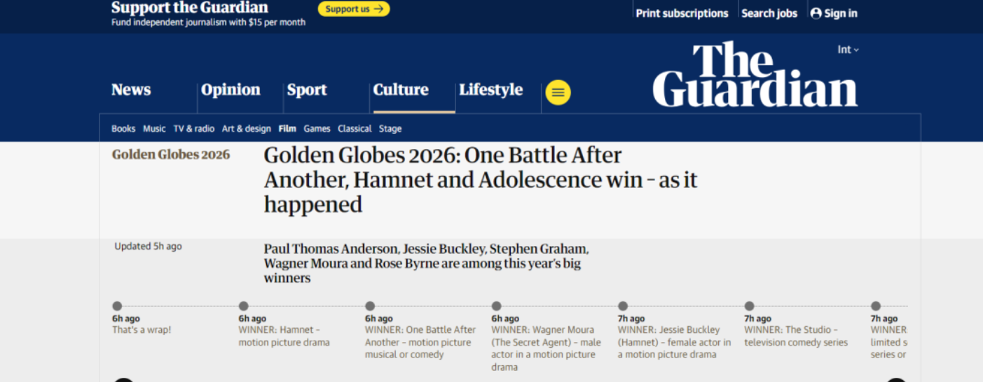 Já o jornal britânico The Guardian incluiu Wagner Moura entre os grandes vencedores da noite, ao lado de nomes como Paul Thomas Anderson (diretor de “Uma Batalha Após a Outra”), Jessie Buckley (“Hamnet”), Stephen Graham (“Adolescência”) e Rose Byrne (“Se Eu Tivesse Pernas, Eu Te Chutaria”).