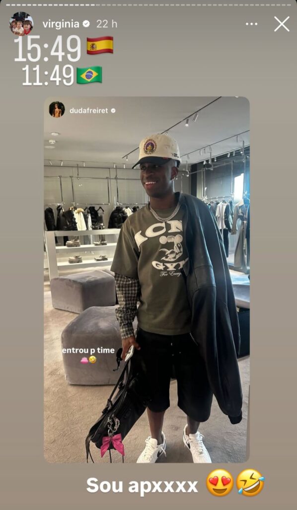 “Sou apaxxx” (apaixonada)”, escreveu ela em uma foto que mostra Vini segurando a bolsa dela.