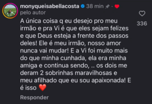 “A única coisa que desejo para meu irmão e para a Vi é que eles sejam felizes e que Deus guie os passos deles! Ele é meu irmão, nosso amor nunca vai mudar! E a Vi foi muito mais do que minha cunhada, ela era minha amiga e continua sendo… Os dois me deram duas sobrinhas maravilhosas e meu afilhado, pelo qual sou apaixonada! E é isso”, escreveu.