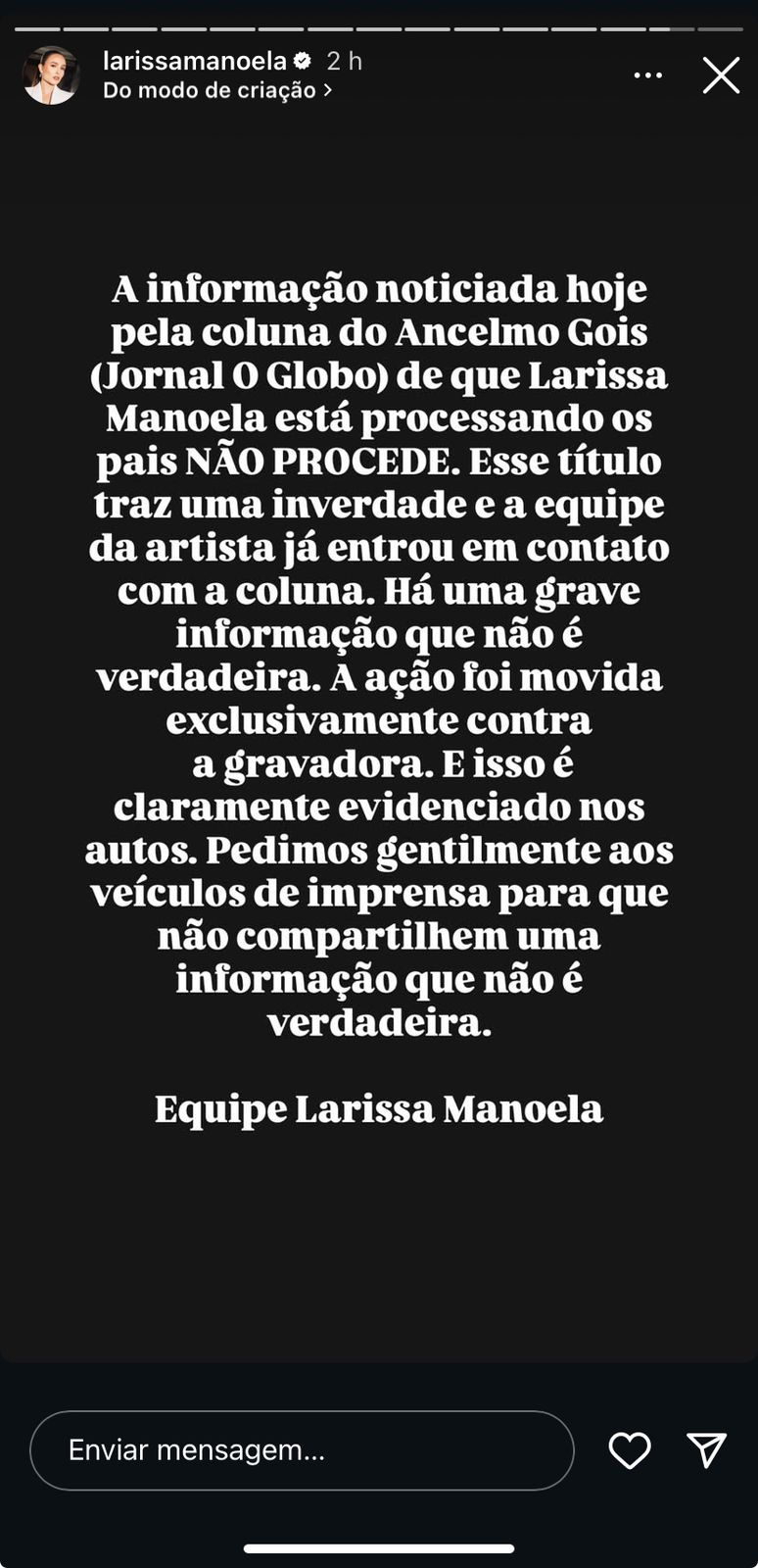 “Há uma grave informação que não é verdadeira. A ação foi movida exclusivamente contra a gravadora. E isso é claramente evidenciado nos autos”, diz a nota divulgada pela equipe de Larissa.
