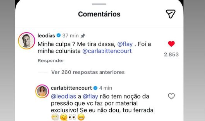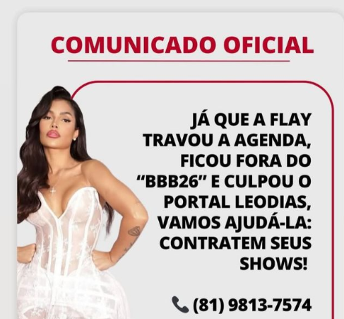 Leo Dias se pronunciou e afirmou que a informação divulgada partiu da colunista Carla Bittencourt. Em uma publicação, o jornalista divulgou a agenda de shows da cantora e escreveu: “Já que a Flay travou agenda, ficou fora do BBB26 e culpou o portal LeoDias, vamos ajudá-la: contratem seus shows!”.