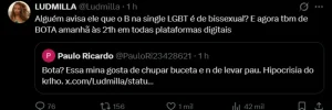 Bissexual assumida, Ludmilla rebateu o ataque com ironia e referência direta à sigla LGBT. A cantora lembrou que a letra “B” representa pessoas bissexuais e aproveitou para reforçar a divulgação do novo trabalho. “E agora também é de Bota. Amanhã, às 21h, em todas as plataformas”, escreveu.