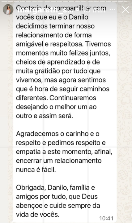 “Gostaria de compartilhar com vocês que eu e o Danilo decidimos terminar nosso relacionamento de forma amigável e respeitosa. Tivemos momentos muito felizes juntos, cheios de aprendizado e de muita gratidão por tudo que vivemos. Mas agora sentimos que é hora de seguir caminhos diferentes. Continuaremos desejando o melhor um ao outro e assim será”, escreveu.