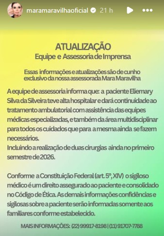 A apresentadora Mara Maravilha, de 57 anos, recebeu alta hospitalar, mas ainda deverá passar por duas cirurgias ao longo deste semestre, segundo informou sua equipe em comunicado divulgado neste domingo (8/2), por meio de suas redes sociais.