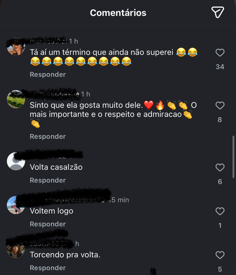 A troca de interações seguiu pouco tempo depois. O cantor também apareceu nos comentários de uma publicação de Ano Novo da atriz, respondendo com os mesmos emojis. O gesto simples foi o suficiente para agitar os seguidores, que passaram a especular sobre uma possível reaproximação entre os dois.