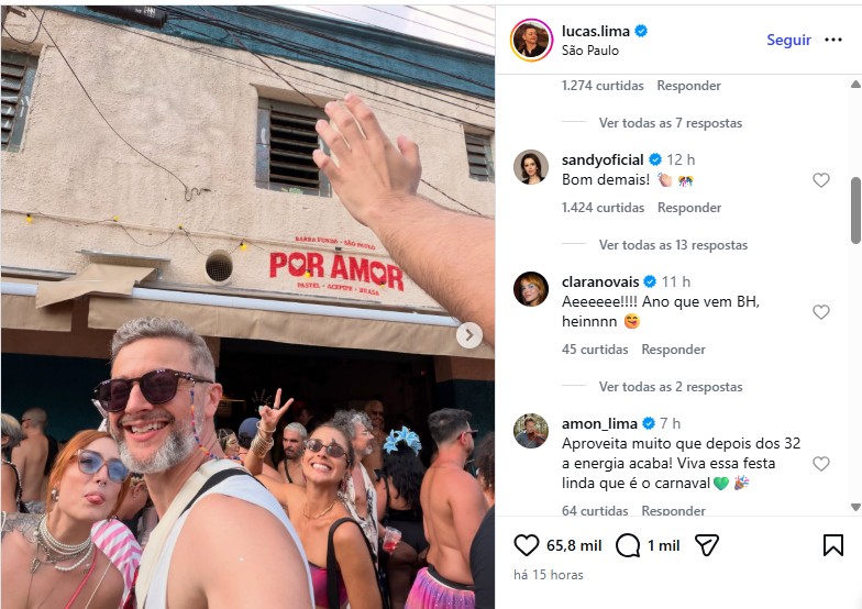 A cantora Sandy comentou em uma publicação do ex-marido, Lucas Lima, que reuniu fotos do Carnaval ao lado da atual namorada, Nina Forlin. Na legenda, o músico afirmou que viveu “o melhor Carnaval” da vida. Sandy respondeu de forma breve: “Bom demais”.
