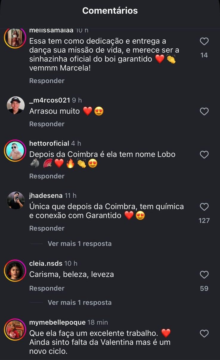 Na sexta (26/12), a bailarina Marcela Lobo particiou de ensaio de pré-Réveillon do Boi Garantido. Quando o vídeo começou a circular nas redes, o nome dela passou a ganhar força para ser apontada como a próxima Sinhazinha da Fazenda do boi vermelho.