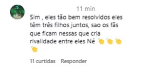 “Pois é, a briga só existe aqui. O pessoal perdeu a noção e quer comandar a vida alheia”, escreveu um internauta. Outro destacou: “Esses fãs que são obcecados. Eles têm filhos juntos, gente. Essa ligação é para a vida toda”. Já um terceiro reforçou: “Sim, eles estão bem resolvidos, têm três filhos juntos, são os fãs que ficam nessas que criam rivalidade entre eles”.