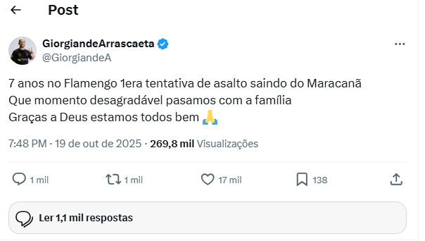 O meia Arrascaeta, autor de um dos gols do Flamengo na vitória sobre o Palmeiras, neste domingo (19/10), afirmou, na rede social X, que foi vítima de uma tentativa de assalto quando deixava o Maracanã com a família.
