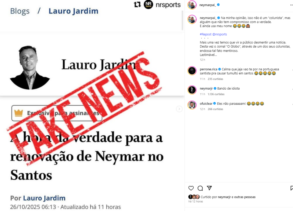 “Na minha opinião, isso não é um “colunista”, mas alguém que não tem compromisso com a verdade. E ainda usa meu nome. Mais uma vez temos que vir a público desmentir uma notícia. Desta vez o Jornal “O Globo”, através de um dos seus colunistas, endossa tal fato mentiroso. Lastimável”, disse o pai de Neymar com uma foto da coluna e a inscrição “fake news” sobre o texto.