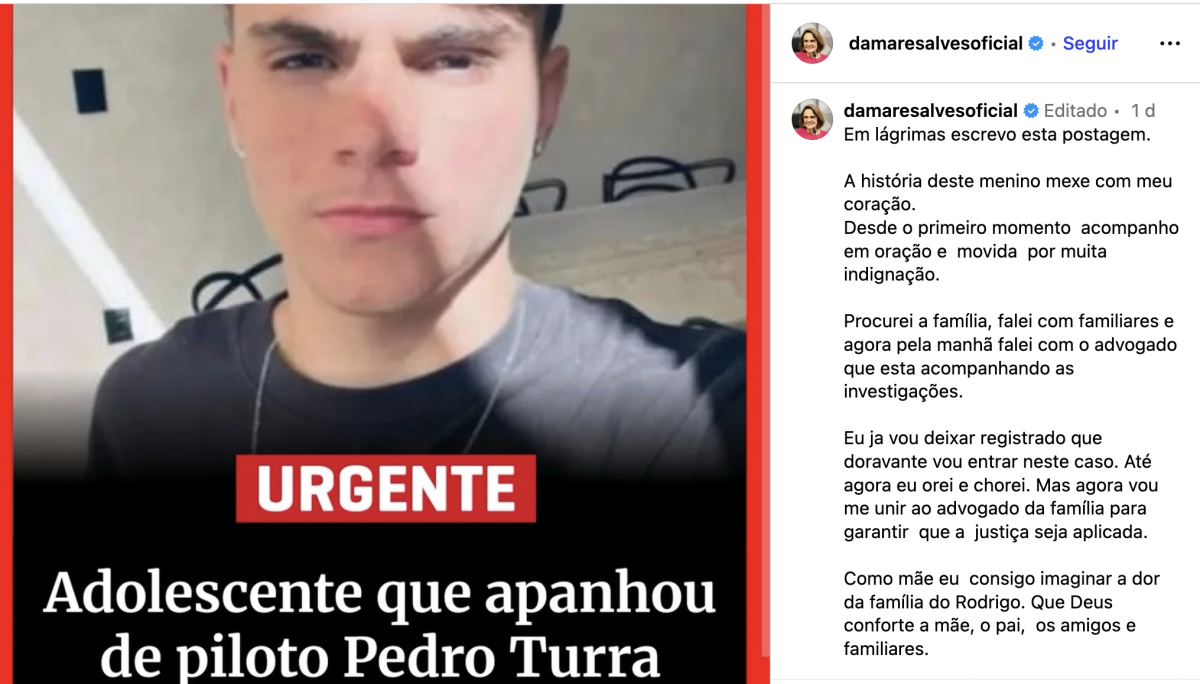 Damares Alves afirmou que acompanha o caso desde o início e que atuará para garantir a responsabilização dos envolvidos. “Como mãe, consigo imaginar a dor da família do Rodrigo. Que Deus conforte pais, amigos e familiares”, declarou. A senadora também defendeu medidas mais firmes de enfrentamento à violência entre jovens.