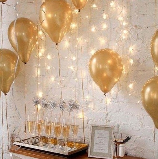 - Balões personalizados com frases, glitter, tinta ou mensagens de “Feliz Ano Novo”