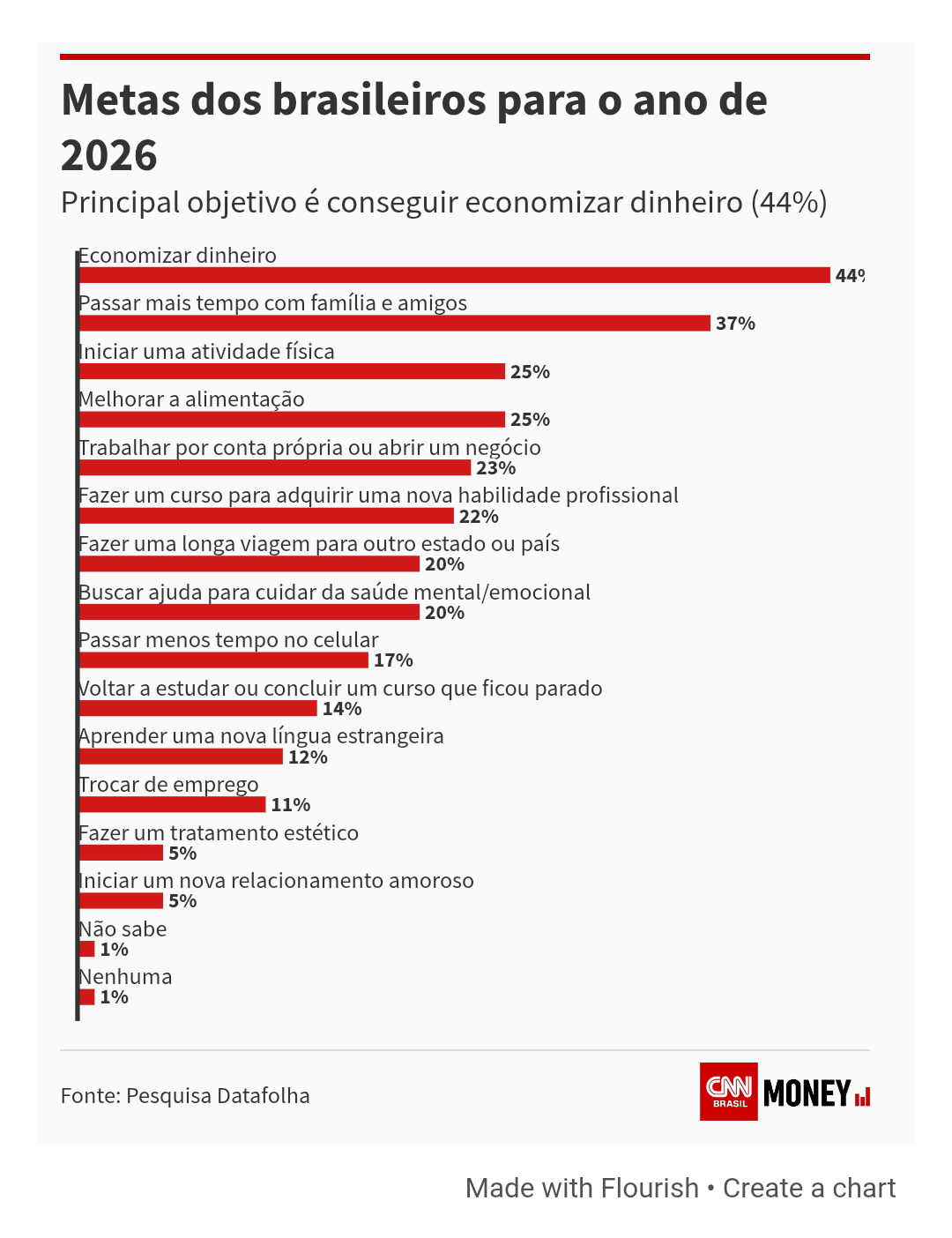Economizar dinheiro é a principal meta dos brasileiros para 2026. De acordo com uma pesquisa do Datafolha, 44% da população indicaram que guardar dinheiro será sua prioridade no próximo ano, à frente de outras 13 metas listadas no levantamento.