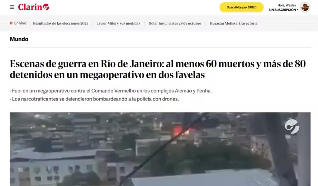 Já o argentino Clarín relembrou a origem do Comando Vermelho nas prisões do Rio nos anos 1970 e publicou imagens que mostram fumaça e fogo nas comunidades, comparando a cena a um “conflito armado”.