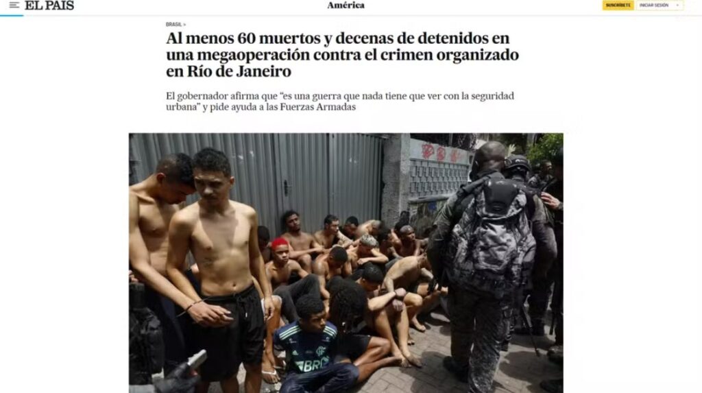O jornal espanhol El País descreveu a cidade como “um cenário de caos colosal” e destacou o pedido do governador Cláudio Castro por ajuda do governo federal e das Forças Armadas.