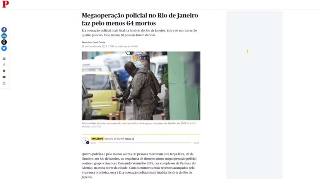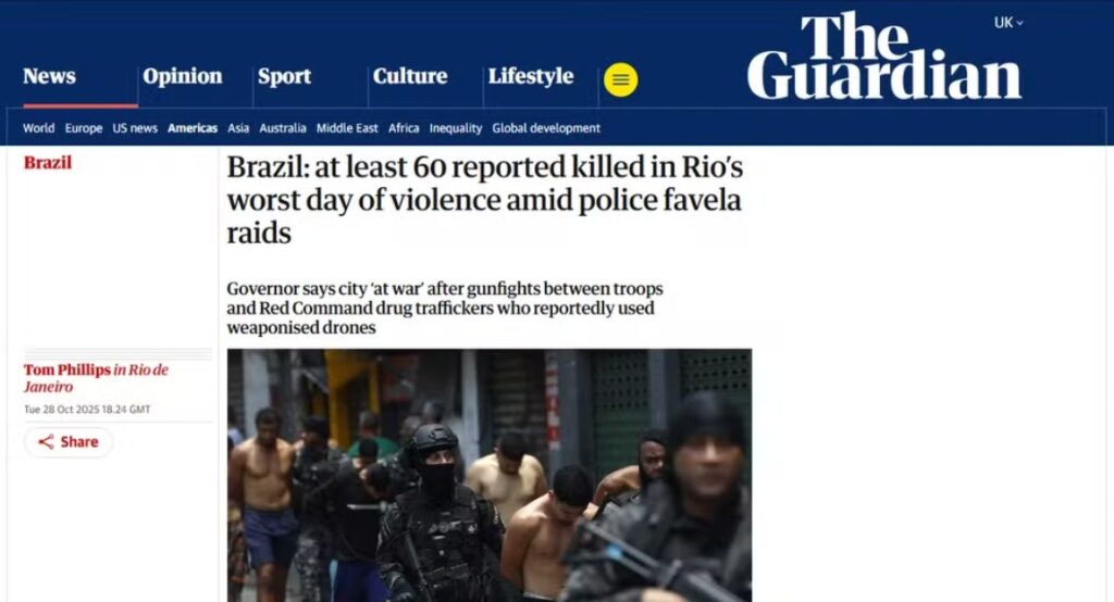 A megaoperação policial contra o Comando Vermelho (CV) nas comunidades do Alemão e da Penha, na Zona Norte do Rio de Janeiro, ganhou forte destaque na imprensa internacional nesta terça-feira (28/10). Segundo dados divulgados pelo governo do Rio de Janeiro, foram registradas 64 mortes no total, sendo 60 suspeitos de envolvimento com o crime organizado e 4 eram policiais — dois civis e dois do Batalhão de Operações Especiais da Polícia Militar (Bope). A ação também resultou em 81 prisões e a apreensão de cerca de 75 fuzis.