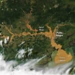 O satélite Landsat 8, o mais avançado em termos de observação, capturou uma imagem da inundação que assola a capital gaúcha, ainda durante o ápice da cheia. A foto, adquirida pela câmera Operational Land Imager embarcada na sonda, detalha a extensão da inundação em praticamente toda a área urbana.