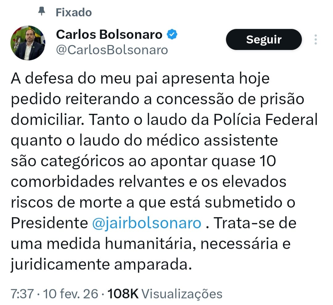O vereador Carlos Bolsonaro (PL-RJ) afirmou nesta terça-feira (10/2), nas redes sociais, que a defesa do ex-presidente Jair Bolsonaro pretende apresentar um novo pedido ao Supremo Tribunal Federal (STF) para a concessão de prisão domiciliar.