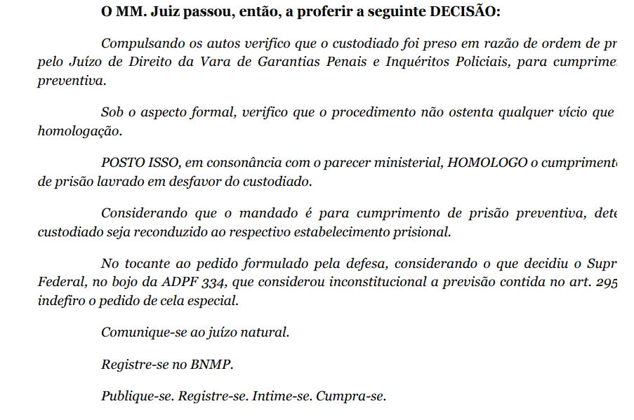 Conforme o termo da audiência (realizada por videoconferência), o juiz Marcelo Cruz de Oliveira homologou o cumprimento do mandado de prisão e determinou que o custodiado fosse reconduzido ao estabelecimento prisional, uma vez que a ordem era para prisão preventiva. No ato, a defesa solicitou cela especial, mas o pedido foi indeferido com base em entendimento do Supremo Tribunal Federal sobre o tema, também registrado no documento.