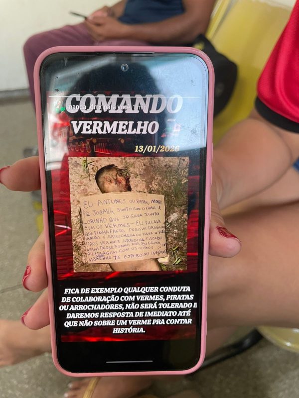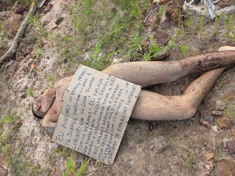 A vítima havia sido jurada de morte pela facção e estava desaparecida desde terça (13/01). Em um pedaço de papelão, os suspeitos pela execução acusaram Antunes de ter relação com facção rival e de roubar drogas do CV para entregar aos rivais.