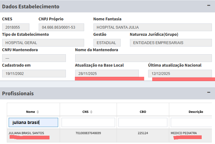 Na plataforma do órgão, a médica Juliana Brasil aparece cadastrada como médica pediatra vinculada à unidade hospitalar. No dia 12 de dezembro, uma nova atualização foi realizada pelo próprio Ministério da Saúde.