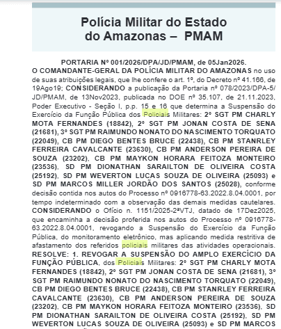 Os dez policiais militares acusados de envolvimento na chacina ocorrida em 2022, no Ramal Água Branca, na AM-010, que resultou na morte de quatro pessoas, retornaram às atividades na Polícia Militar do Amazonas. Atualmente, eles estão lotados na Diretoria de Ensino da corporação, setor responsável pela gestão e coordenação da formação educacional interna.