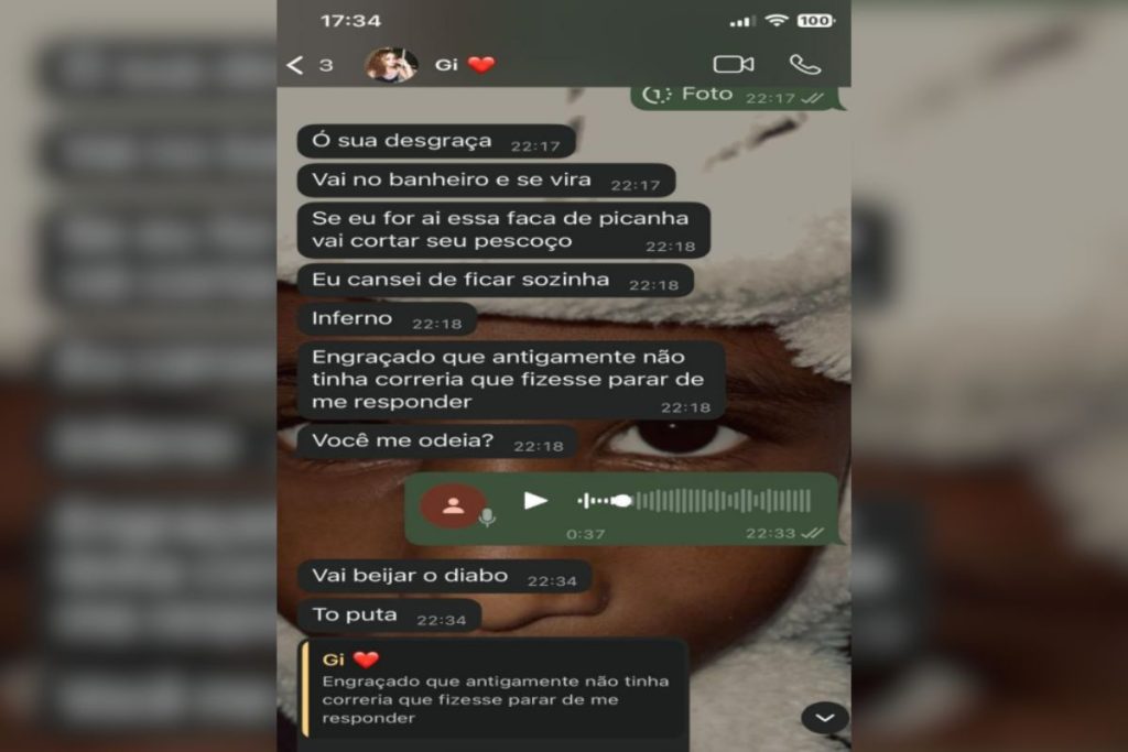 Em seguida, utiliza expressões como “anseio de ter” e “tédio de possuir”, indicando um discurso marcado por frustração e controle. Raphael responde com um áudio de cerca de 13 segundos. Logo depois, Geovanna rebate com a mensagem “tudo você leva na brincadeira, né?” e envia uma sequência de três mensagens — que foram apagadas pouco após o envio, segundo a Polícia Civil.