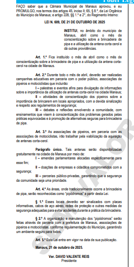 A Câmara Municipal de Manaus (CMM) promulgou a Lei nº 609, de 21 de outubro de 2025, que institui o mês de abril como o período oficial de conscientização sobre a brincadeira de pipa e o uso da antena corta-cerol na capital amazonense. A promulgação foi publicada no Diário Oficial do Legislativo Municipal e conta com a assinatura da Mesa Diretora da Casa Legislativa.