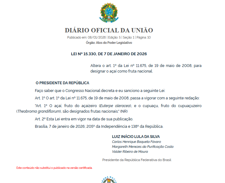 O açaí passou a ser oficialmente reconhecido como fruta nacional. A medida está prevista na Lei nº 15.330, de 2026, publicada nesta quinta-feira (8/1) no Diário Oficial da União (DOU). A expectativa é de que o reconhecimento fortaleça a identidade do açaí como produto tipicamente brasileiro e contribua para a proteção contra a biopirataria.