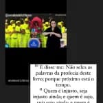 Michelle então compartilhou diversos versículos bíblicos e encerrou dizendo que as profecias descritas acontecerão “você acreditando ou não”. A ex-primeira-dama ainda compartilhou uma notícia sobre os problemas enfrentados pelo trio de Ivete Sangalo e declarou: “Deus teve muita misericórdia… Quantas pessoas não perderiam suas vidas? Não brinquem e nem desafiem Deus”.