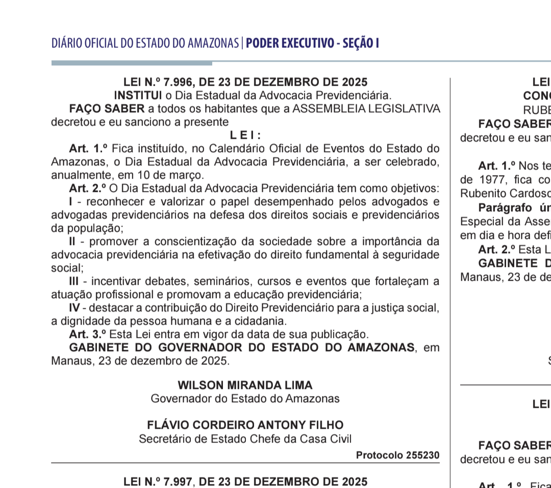 O Governo do Amazonas sancionou a Lei nº 7.996, publicada no Diário Oficial do Estado (DOE), que institui o Dia Estadual da Advocacia Previdenciária. A data será celebrada anualmente em 10 de março e passa a integrar o Calendário Oficial de Eventos do estado.