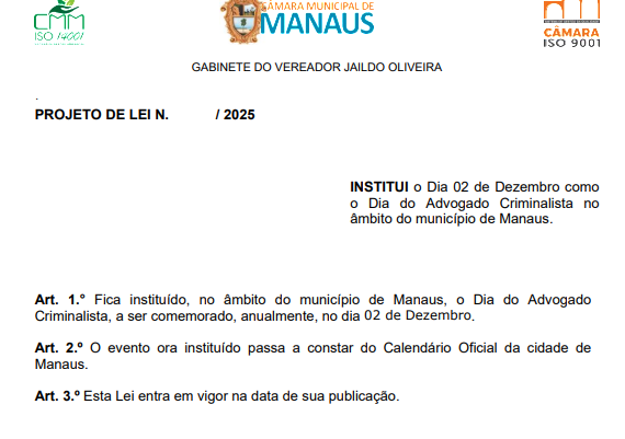 A proposta estabelece ainda que a lei entre em vigor na data de sua publicação, consolidando oficialmente o reconhecimento da advocacia criminalista no calendário de datas comemorativas de Manaus.
