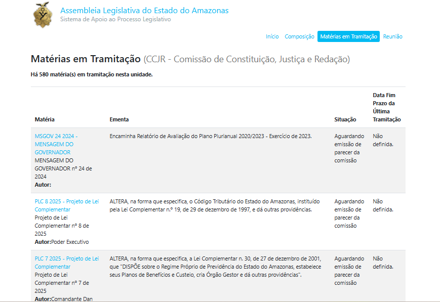 A Comissão de Constituição, Justiça e Redação (CCJR) da Assembleia Legislativa do Amazonas (Aleam) acumula 580 matérias que ainda aguardam análise para seguir em tramitação nas outras Comissões da Casa Legislativa. O levantamento foi realizado pela Rede Onda Digital, com base em dados do Sistema de Apoio ao Processo Legislativo (SAPL).