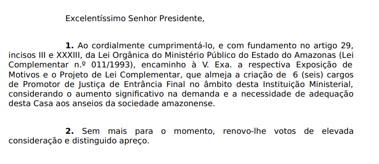 “A criação de seis Promotorias de Justiça de entrância final revela-se medida necessária e plenamente justificada pelo interesse público, na medida em que visa adequar a estrutura institucional ao crescimento expressivo das demandas na Comarca de Manaus e à ampliação das atribuições ministeriais”, argumenta a procuradora na exposição de motivos que acompanha o projeto.