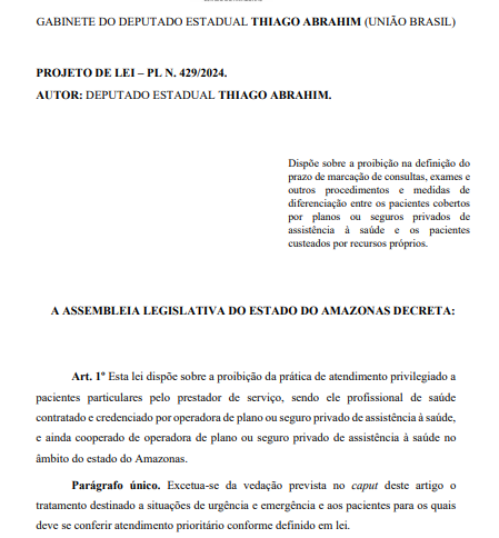 A Assembleia Legislativa do Amazonas (Aleam) aprovou, em sessão plenária da última terça-feira (21/10), o Projeto de Lei do deputado estadual Thiago Abrahim (União Brasil) que proíbe o atendimento privilegiado a pacientes particulares por profissionais de saúde contratados, credenciados ou cooperados de operadoras de planos, ou seguros privados de assistência à saúde no estado.