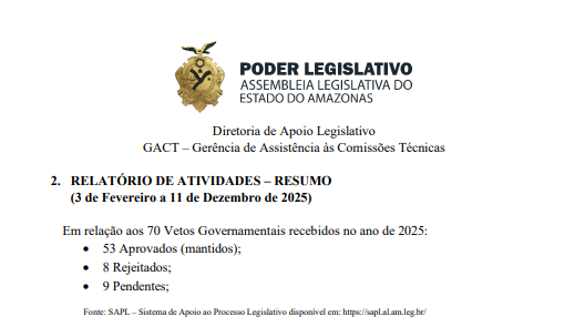 A Assembleia Legislativa do Estado do Amazonas (Aleam) analisou, ao longo de 2025, um total de 70 vetos governamentais encaminhados pelo Poder Executivo. Os dados constam no relatório anual da Diretoria de Apoio Legislativo, por meio da Gerência de Assistência às Comissões Técnicas, e abrangem o período de 3 de fevereiro a 11 de dezembro.