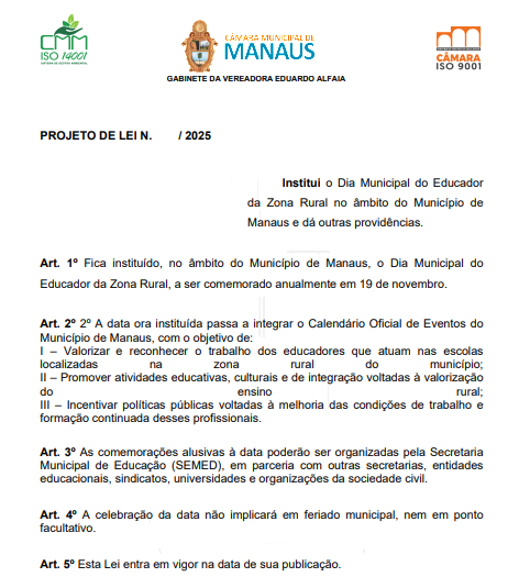 Segundo o projeto de lei, a data passa a integrar o Calendário Oficial de Eventos do Município de Manaus e tem como objetivo valorizar e reconhecer o trabalho dos professores que atuam nas escolas da Zona Rural, além de promover ações voltadas à valorização do ensino e das condições de trabalho desses profissionais.
