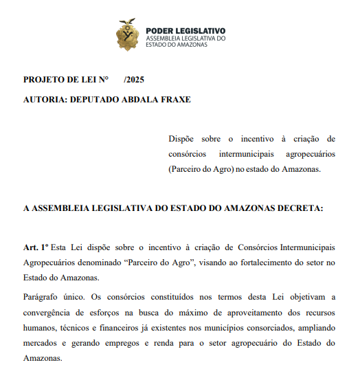O deputado estadual Abdala Fraxe (Avante) apresentou na Assembleia Legislativa do Amazonas (Aleam) um projeto de lei que cria o programa “Parceiro do Agro”, voltado à formação de Consórcios Intermunicipais Agropecuários com o objetivo de fortalecer o setor e gerar desenvolvimento econômico no interior do Estado.
