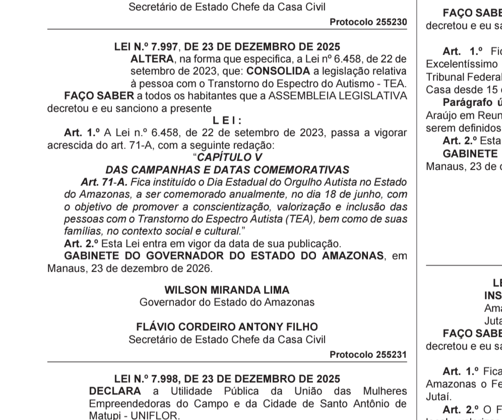 O Governo do Amazonas sancionou a Lei nº 7.997, publicada no Diário Oficial do Estado (DOE), que institui o Dia Estadual do Orgulho Autista. A data será celebrada anualmente em 18 de junho e passa a integrar o calendário oficial do Estado.