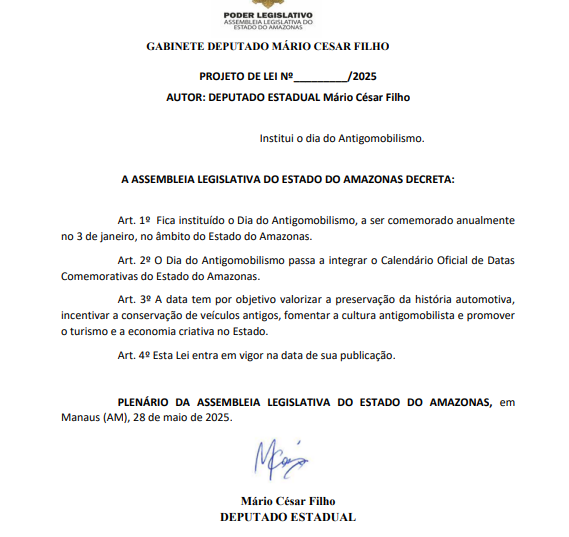 A Assembleia Legislativa do Amazonas (Aleam) aprovou, na sessão desta quinta-feira (11/12), o projeto de lei do deputado estadual Mário César Filho (União Brasil) que institui o Dia do Antigomobilismo no estado.