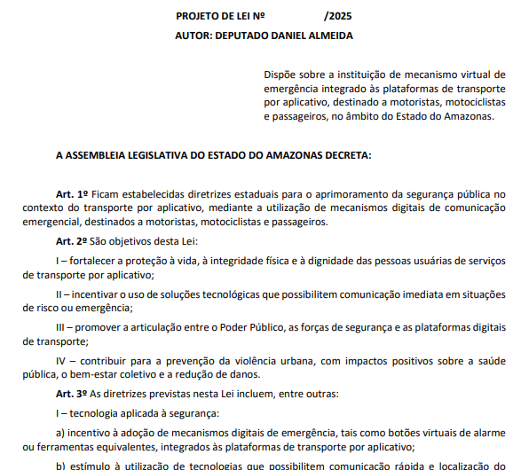 A proposta amazonense prevê incentivo à adoção de ferramentas como botões virtuais de alerta integrados às plataformas, os mais conhecidos como “botão do pânico”, com possibilidade de compartilhamento de localização em tempo real e dados básicos da corrida em situações de risco. O texto também estimula a articulação entre Poder Público, forças de segurança e empresas de transporte por aplicativo, além de autorizar o Executivo a firmar convênios e acordos de cooperação para viabilizar os mecanismos.