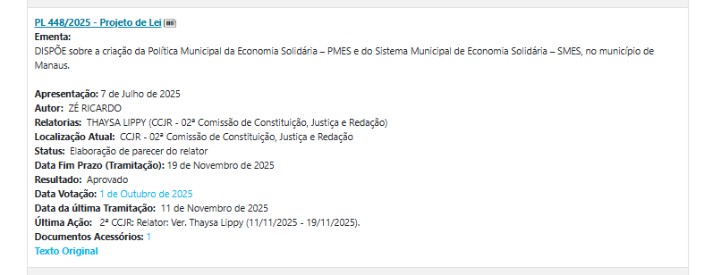 - Projeto de Lei para criar a Política Municipal de Economia Solidária;