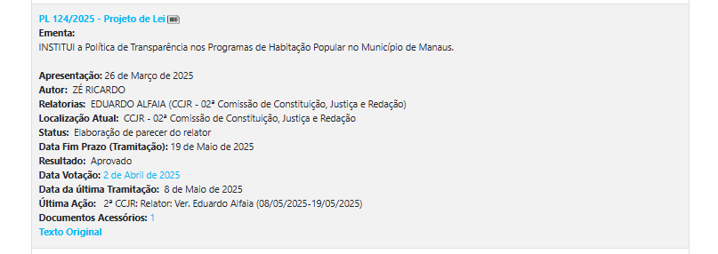 - Projeto de Lei que aumenta a transparência nos processos de programas habitacionais, defendendo que os moradores inscritos nesses programas tenham acesso claro às listas de contemplação e o combate a possíveis fraudes ou “fura-filas”;